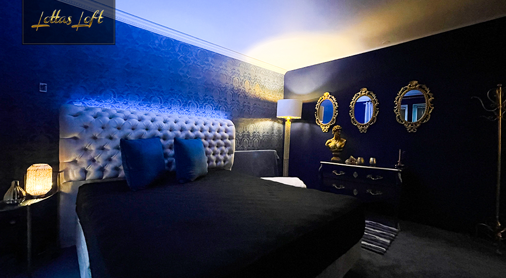Das helle graue Bett, das zentral im Raum steht, bildet einen ansprechenden Kontrast zu den dunkelblauen Wänden und Accessoires, die den Raum in eine tiefe, beruhigende Atmosphäre hüllen.