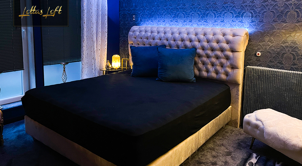 Warme Beleuchtung und einladende Farben sorgen für ein harmonisches Ambiente, das durch romantisches Kerzenlicht noch verstärkt wird, was den Raum in ein sanftes, wohltuendes Licht taucht.
