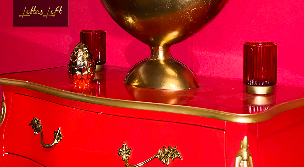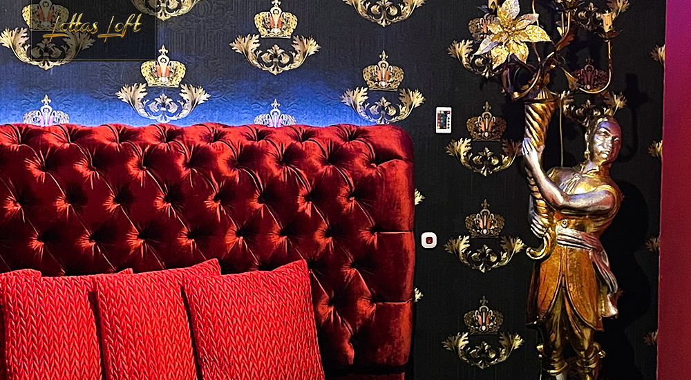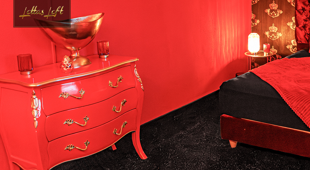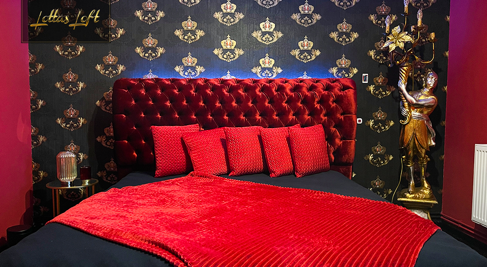 Das hochwertige rote Bett bildet das Herzstück des Zimmers, umgeben von schwarzen und goldenen Accessoires, die eine kraftvolle und königliche Atmosphäre schaffen.