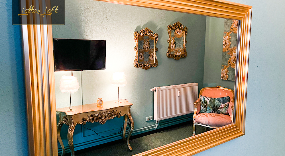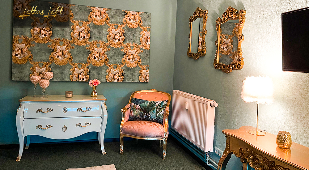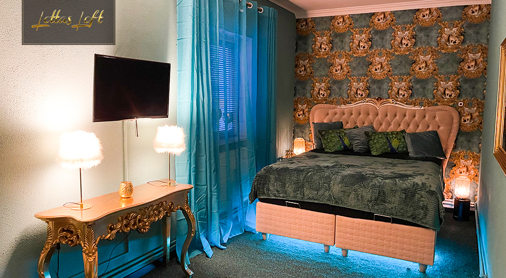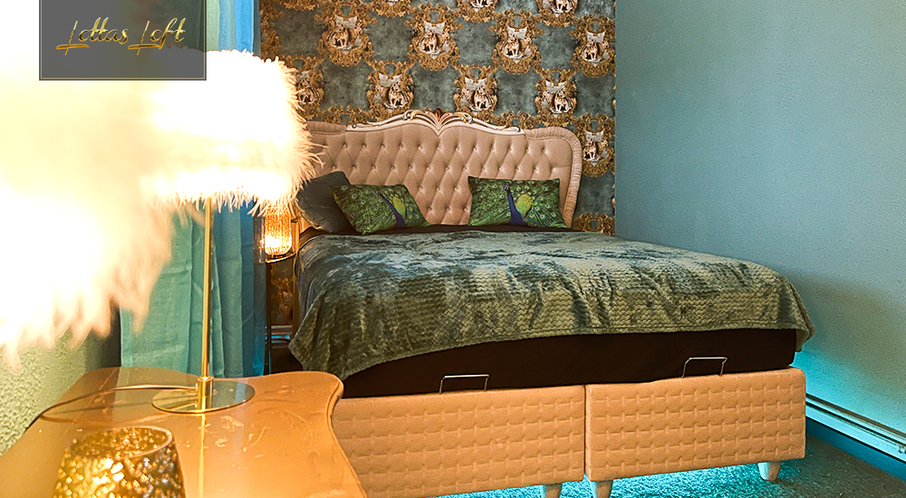 Dieses Apartment ist ein frischer, lebendiger Rückzugsort, der durch seine hellen, türkisfarbenen Wände und luxuriöse Accessoires eine belebende und tropische Atmosphäre schafft.