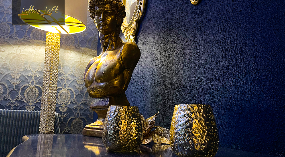 Die geschickt platzierten goldenen Akzente verleihen dem Zimmer einen Hauch von Luxus, der die schlichte Eleganz der blauen Farbpalette perfekt ergänzt. Diese Kombination schafft eine entspannende und erfrischende Umgebung, in der man den Alltag hinter sich lassen kann.