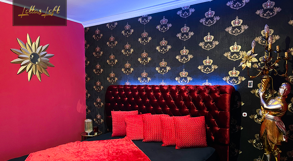 Das hochwertige rote Bett bildet das Herzstück des Zimmers, umgeben von schwarzen und goldenen Accessoires, die eine kraftvolle und königliche Atmosphäre schaffen.